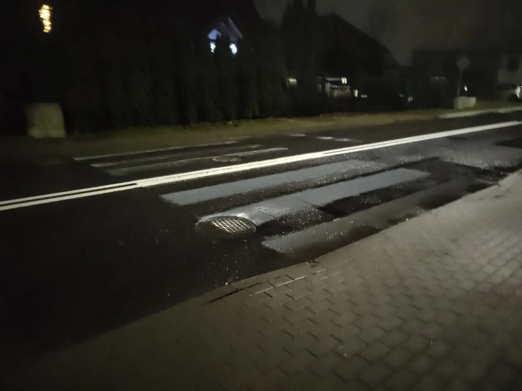 a tutaj przejście dla pieszych, ale jakie? sugerowane? zebra? jest zebra, no prawie, na jednym pasie, a na drugim jej nie ma, znaku pionowego o przejściu też nie ma